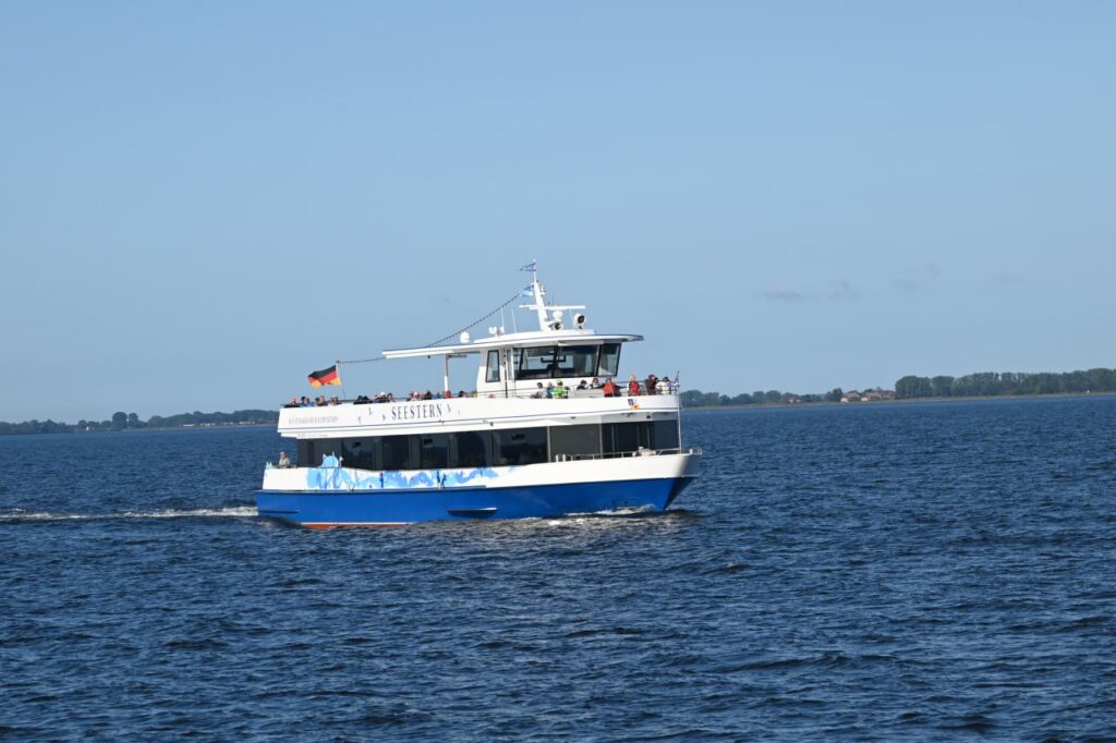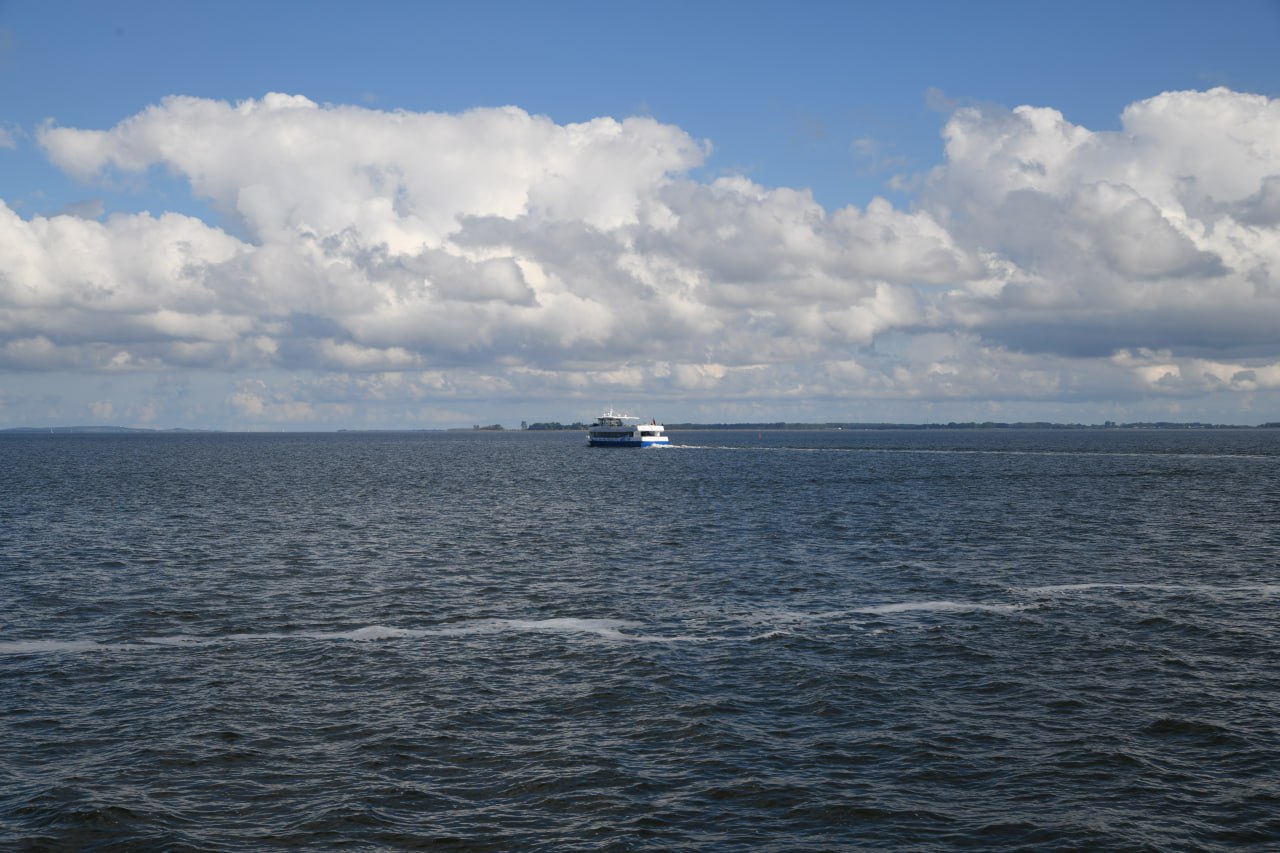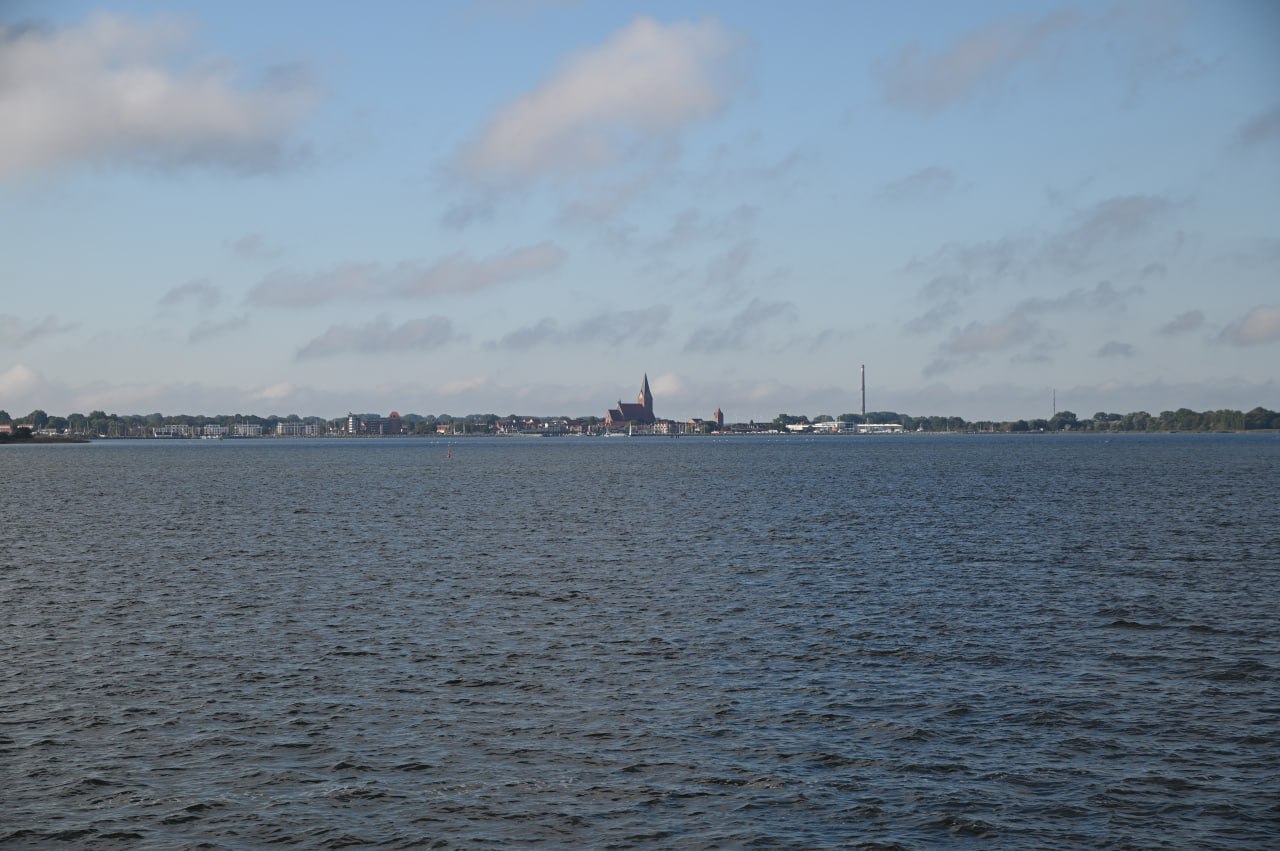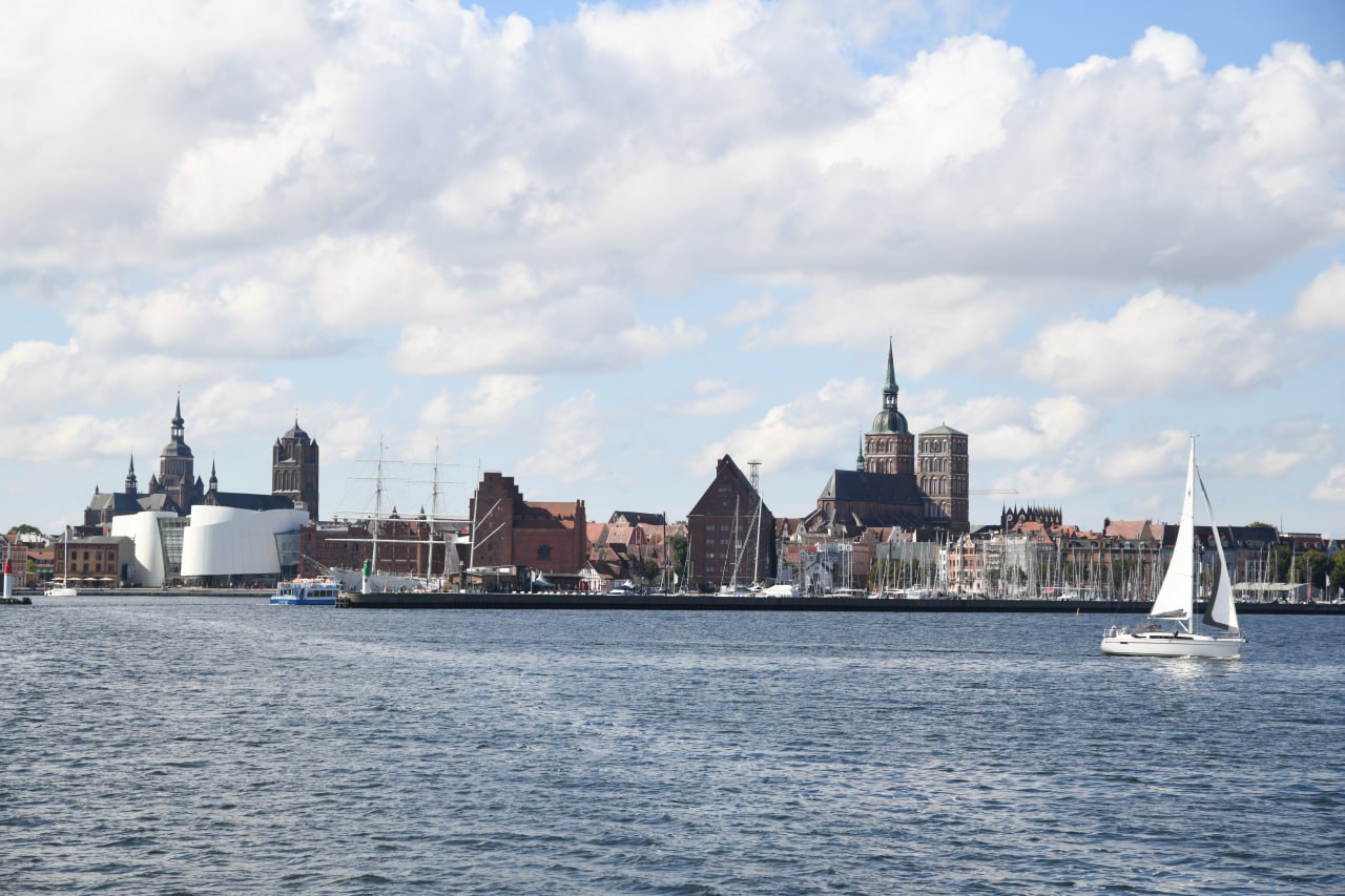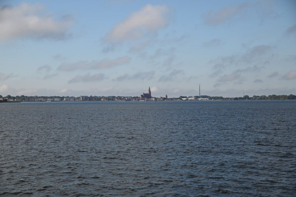 Heute morgen ging es wieder früh los – wir mussten ein Schiff nach Stralsund erwischen. Also haben wir und nur schnell angezogen, die Zähne geputzt, Brötchen fürs Frühstück geholt (und geschmiert) – und dann gings auch schon los (die Rucksäcke hatten wir gestern abend schon gepackt). Um halb 9 waren wir dann am Hafen in Zingst, wo um 9 Uhr unser Boot nach Stralsund ablegen sollte. Es war nicht so viel los, so dass wir problemlos Sitzplätze auf dem oberen Deck bekommen haben und einer gemütlichen Fahrt durch die Boddenlandschaft entgegen sehen konnten.