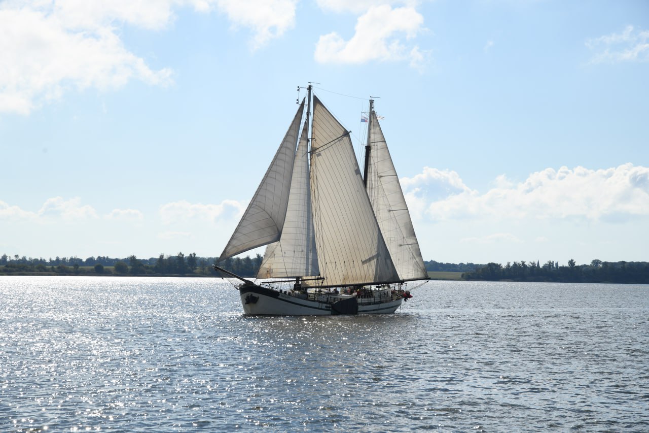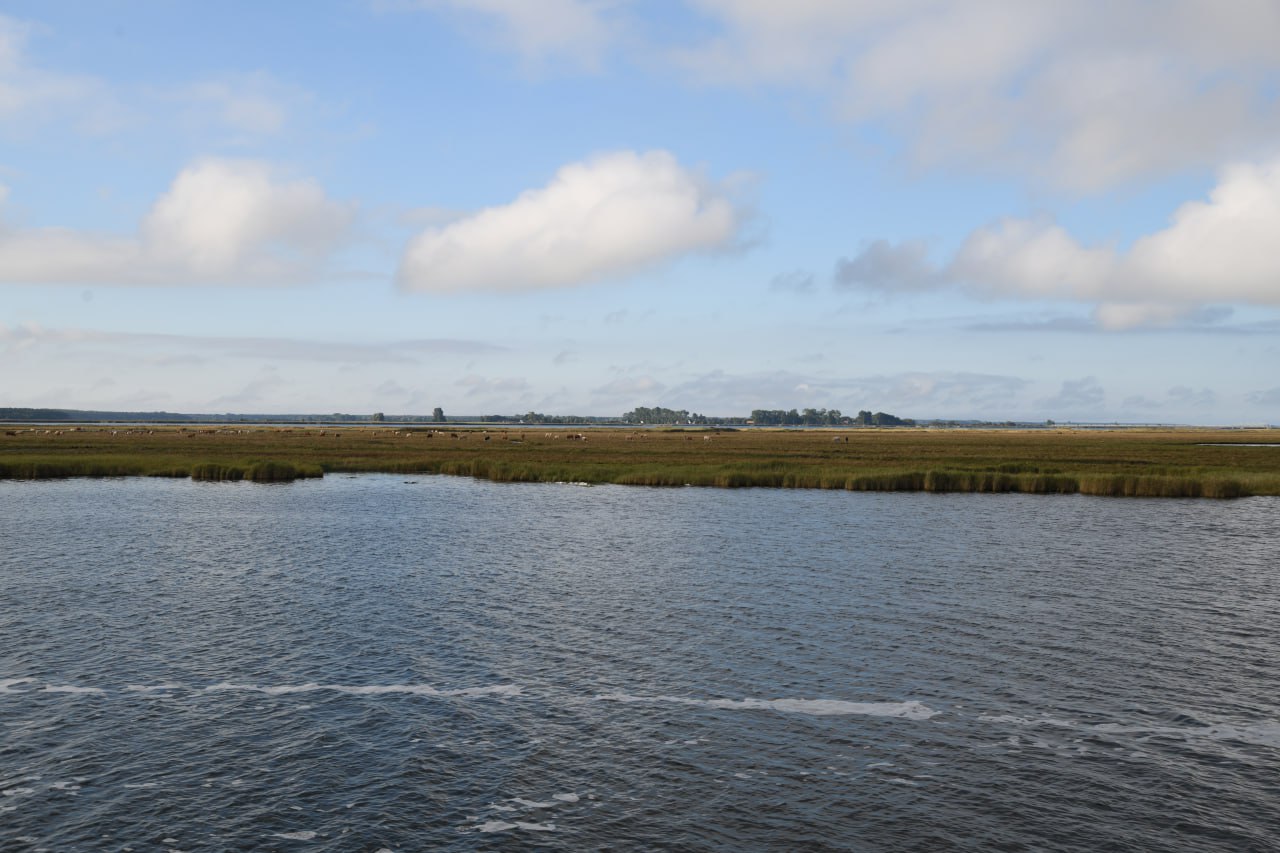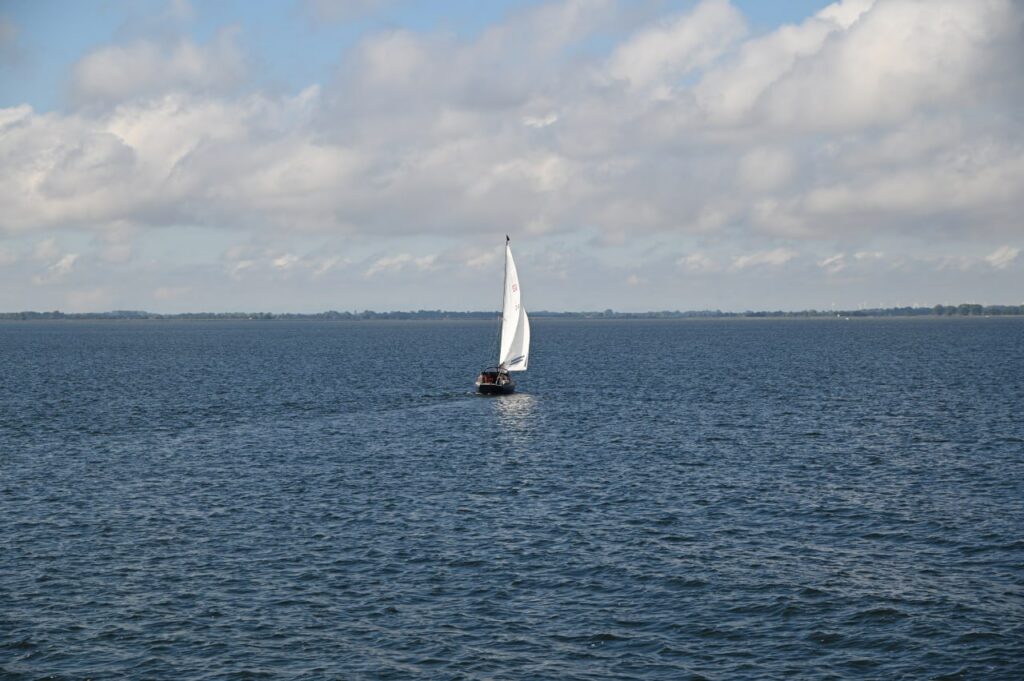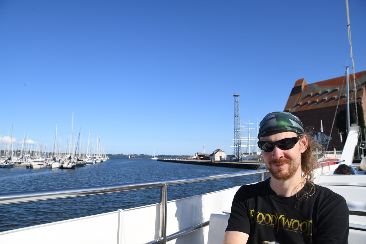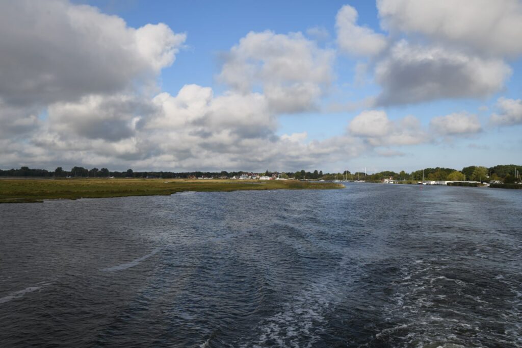 Heute morgen ging es wieder früh los – wir mussten ein Schiff nach Stralsund erwischen. Also haben wir und nur schnell angezogen, die Zähne geputzt, Brötchen fürs Frühstück geholt (und geschmiert) – und dann gings auch schon los (die Rucksäcke hatten wir gestern abend schon gepackt). Um halb 9 waren wir dann am Hafen in Zingst, wo um 9 Uhr unser Boot nach Stralsund ablegen sollte. Es war nicht so viel los, so dass wir problemlos Sitzplätze auf dem oberen Deck bekommen haben und einer gemütlichen Fahrt durch die Boddenlandschaft entgegen sehen konnten.