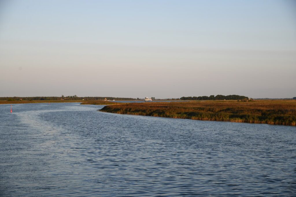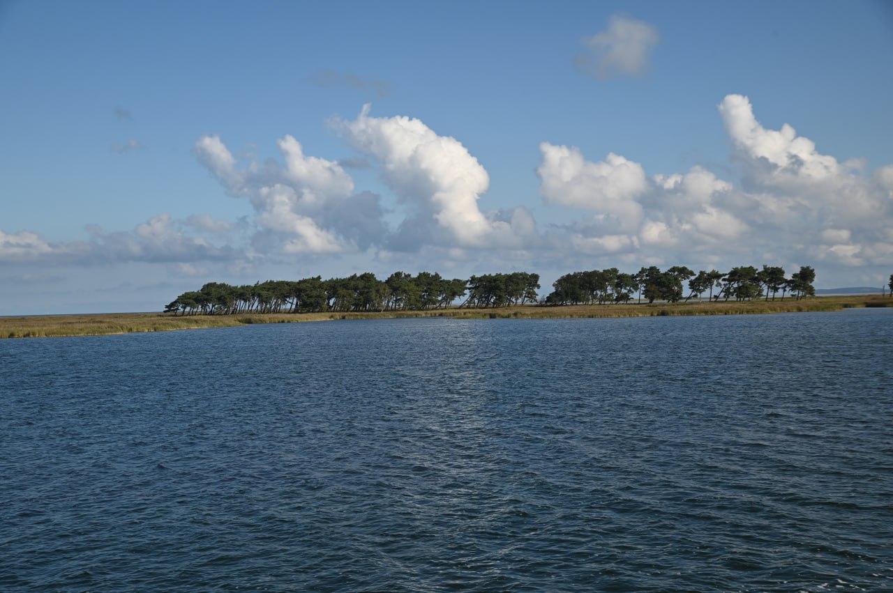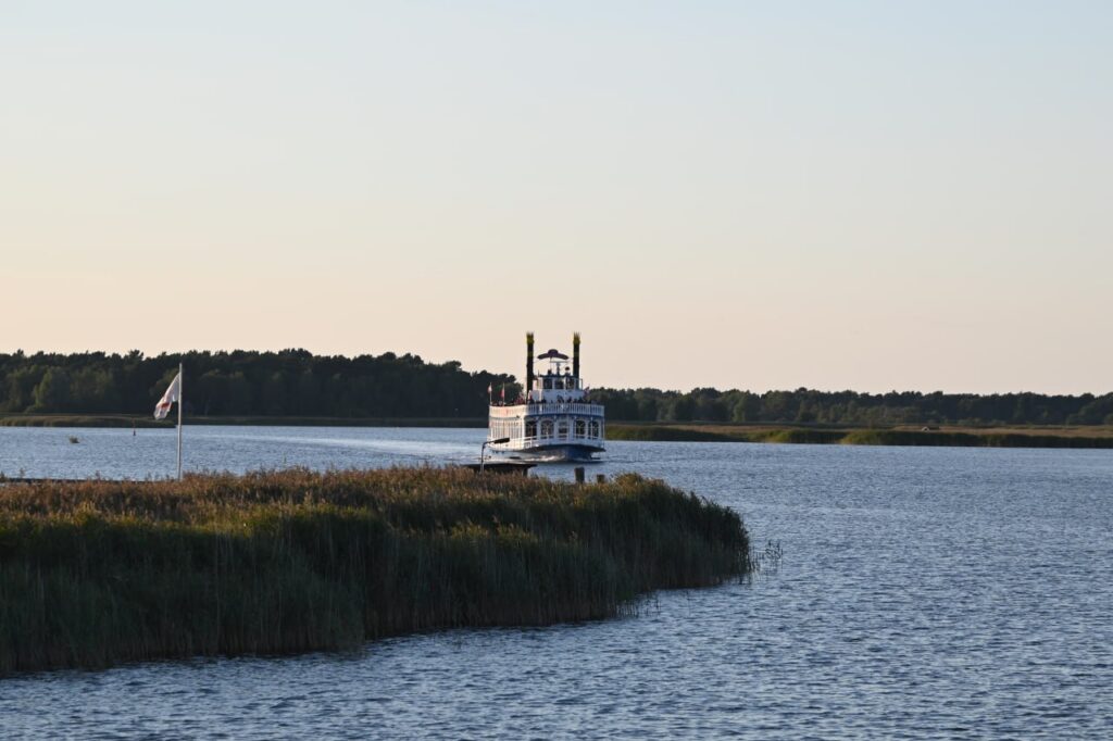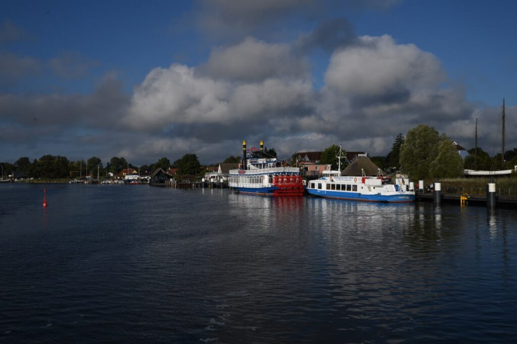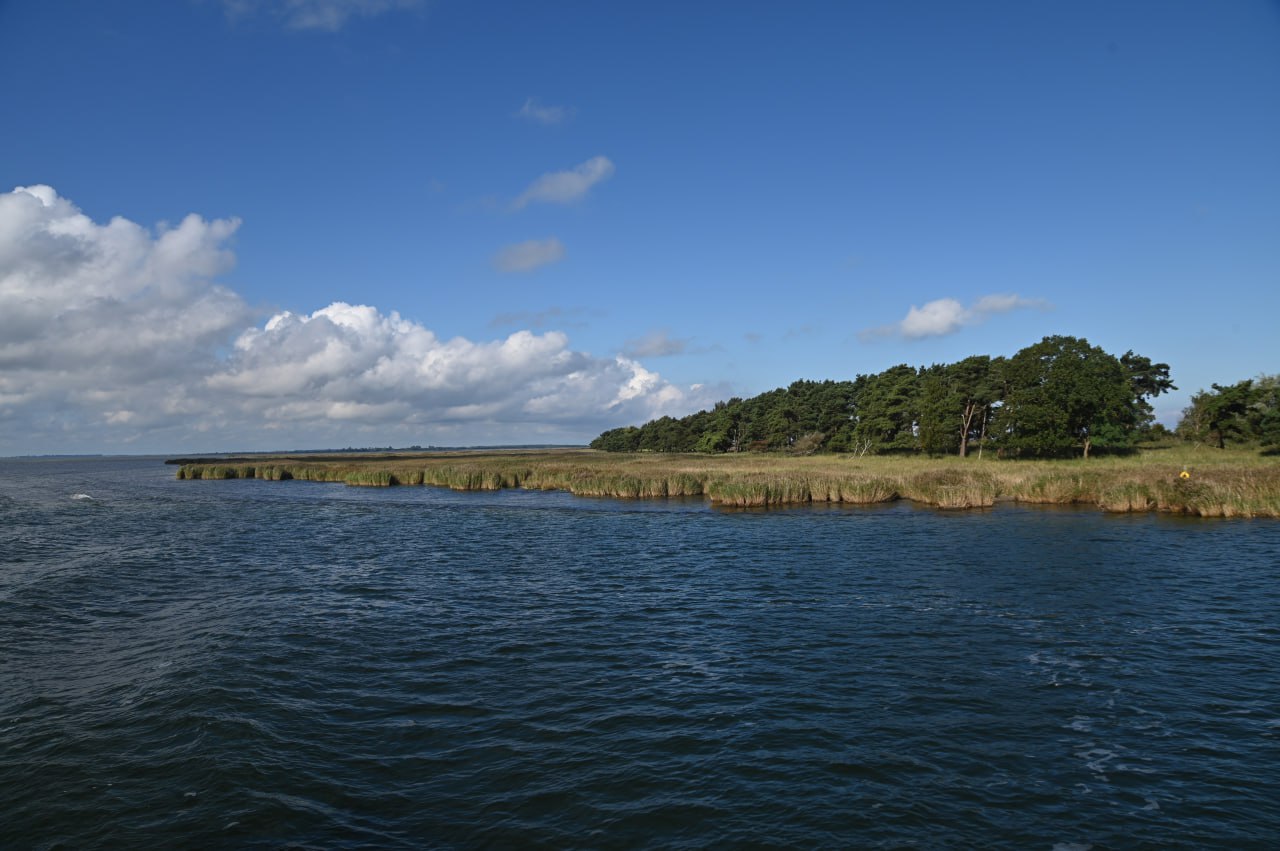 Heute morgen ging es wieder früh los – wir mussten ein Schiff nach Stralsund erwischen. Also haben wir und nur schnell angezogen, die Zähne geputzt, Brötchen fürs Frühstück geholt (und geschmiert) – und dann gings auch schon los (die Rucksäcke hatten wir gestern abend schon gepackt). Um halb 9 waren wir dann am Hafen in Zingst, wo um 9 Uhr unser Boot nach Stralsund ablegen sollte. Es war nicht so viel los, so dass wir problemlos Sitzplätze auf dem oberen Deck bekommen haben und einer gemütlichen Fahrt durch die Boddenlandschaft entgegen sehen konnten.