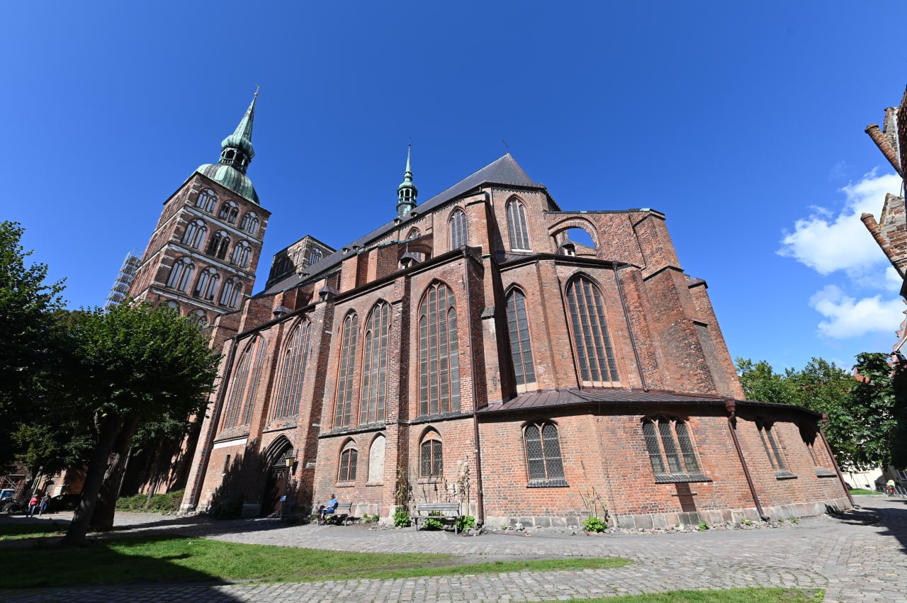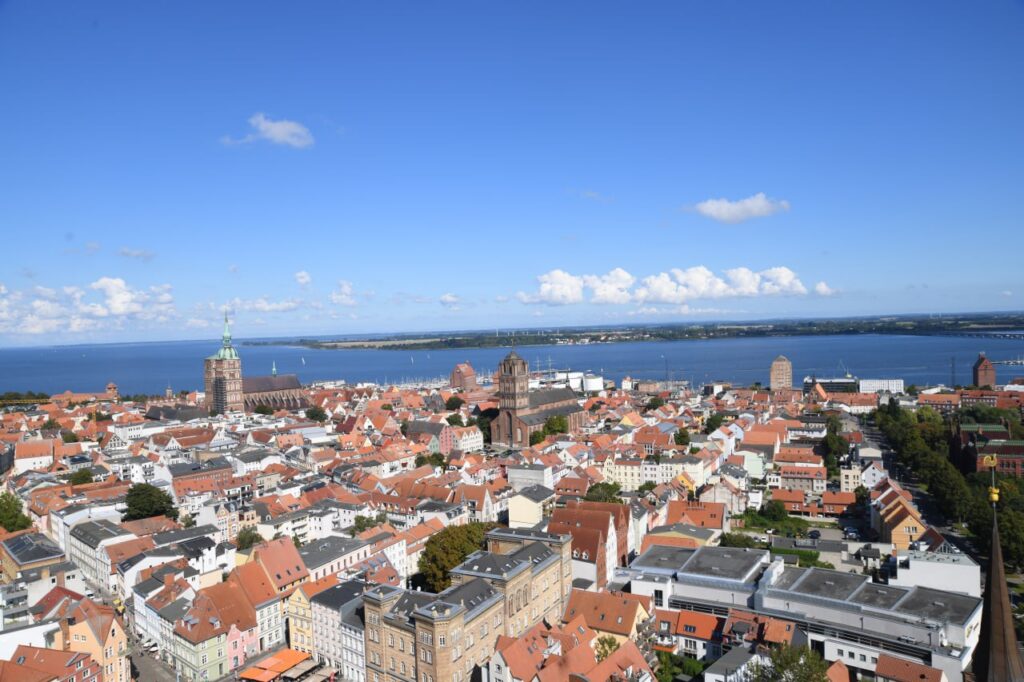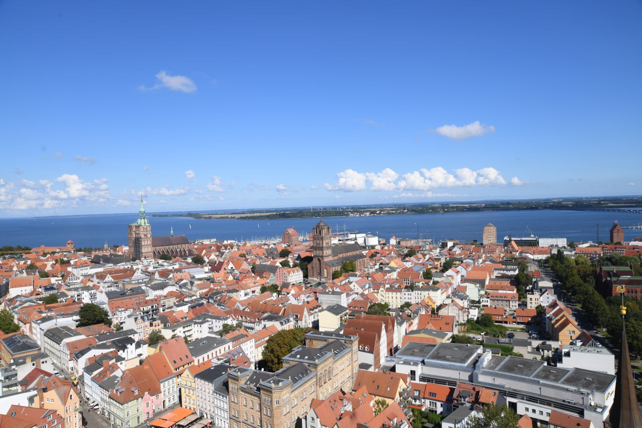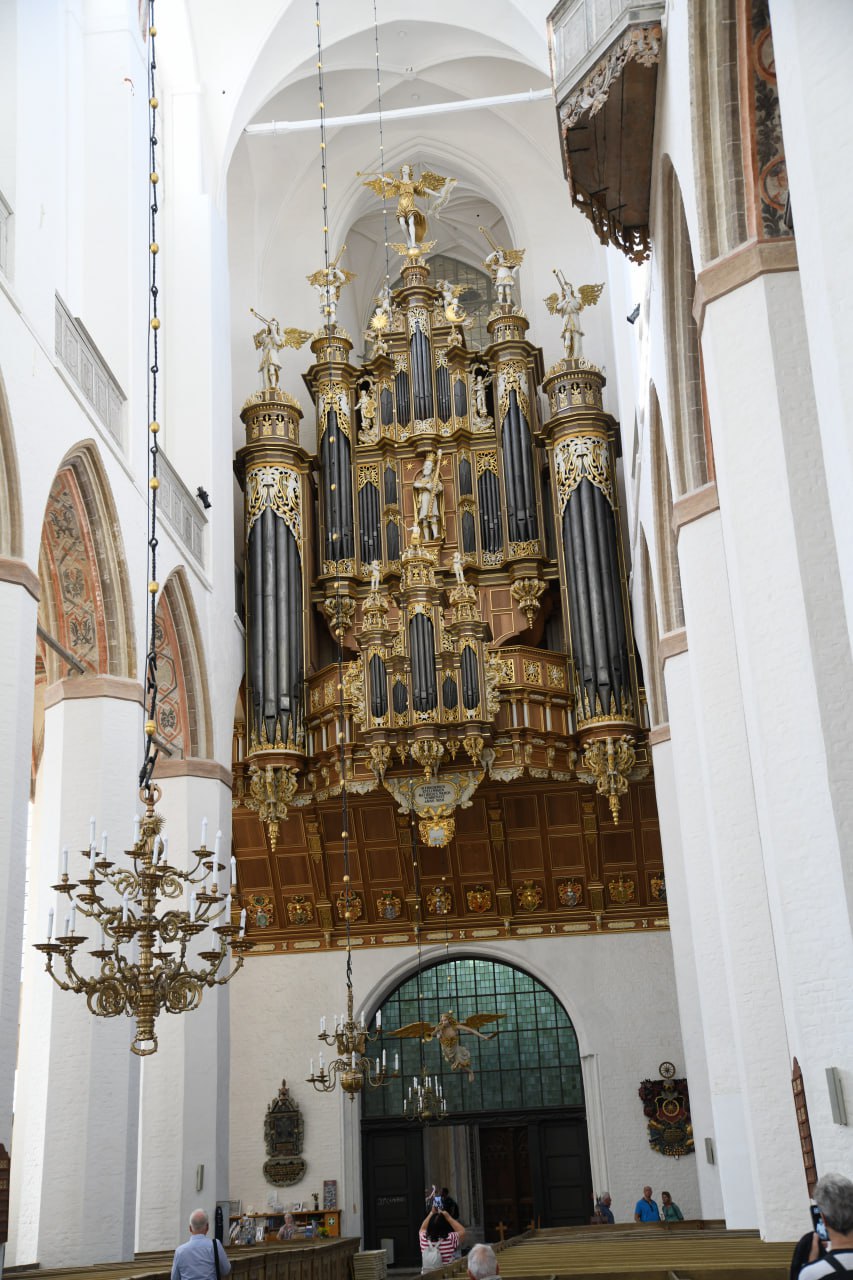 Von dort ging es ein Stück die alte Stadtmauer entlang, bis wir durch Kütertor wieder in die Altstadt gelangten. Dort kamen wir am Meeresmuseum vorbei (in einem alten Kloster untergebracht – auch dafür hatten wir keine Zeit) zum neuen Markt und der Marienkirche. Auch diese Kirch haben wir uns natürlich angesehen, sie ist sehr viel nüchterner als die Nikolaikirche, aber auch sehr schön. Vom Turm aus hat man einen guten Ausblick, wenn man sich denn den Aufstieg über immer schmaler und steiler werdende Treppen (am Ende eher Leitern) antun möchte.