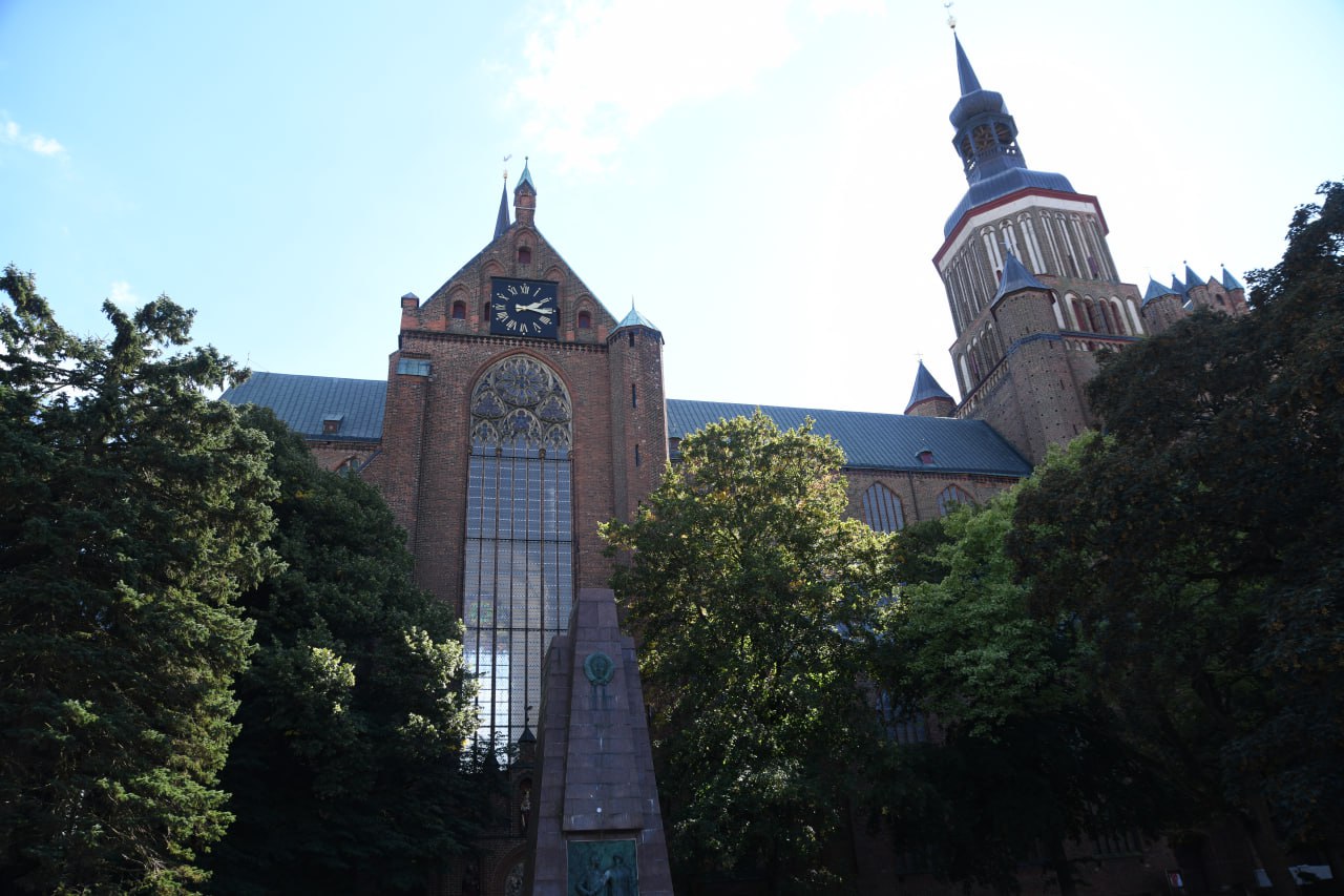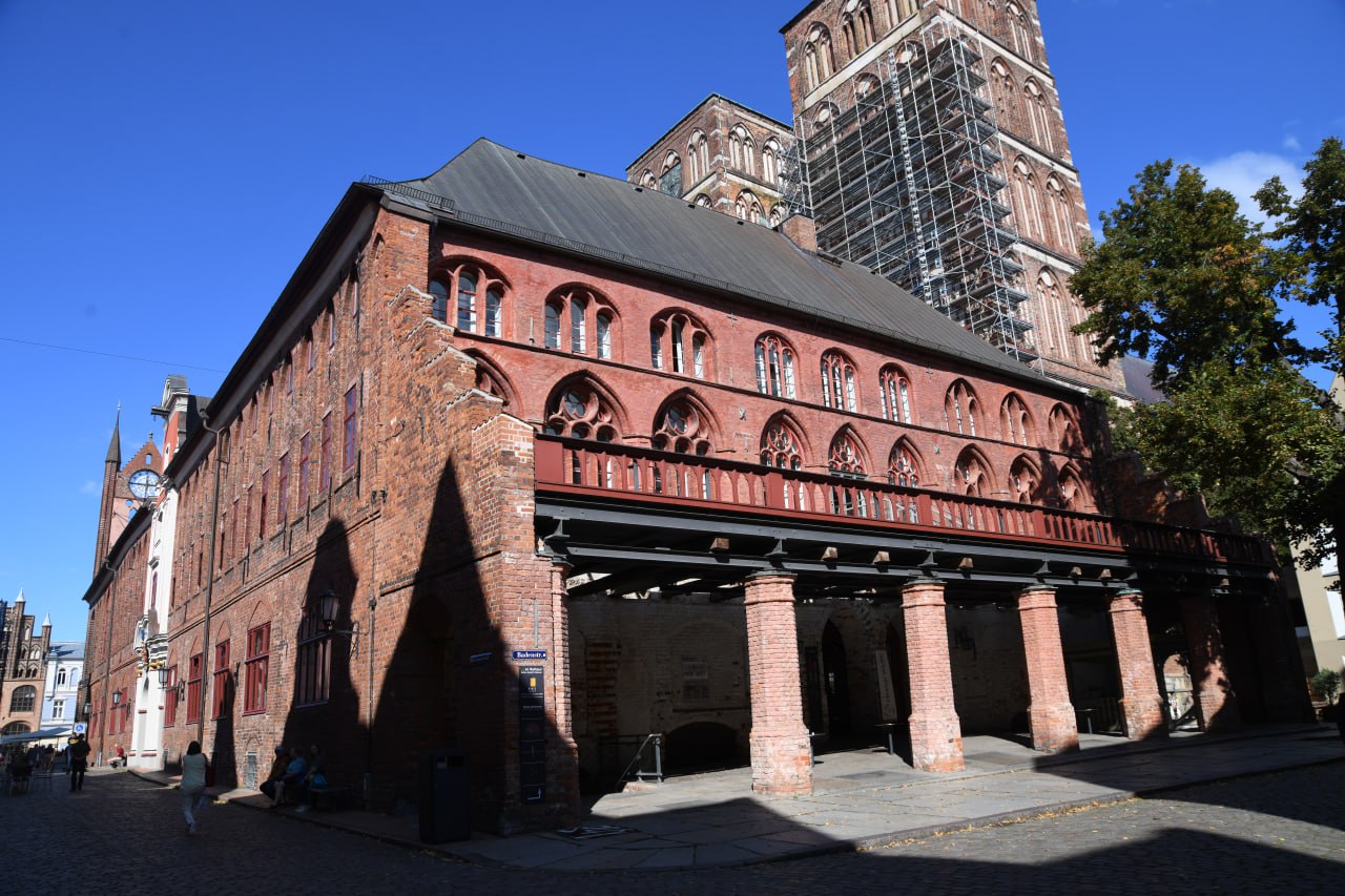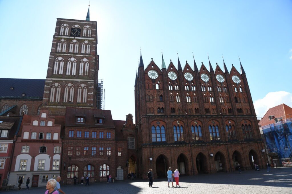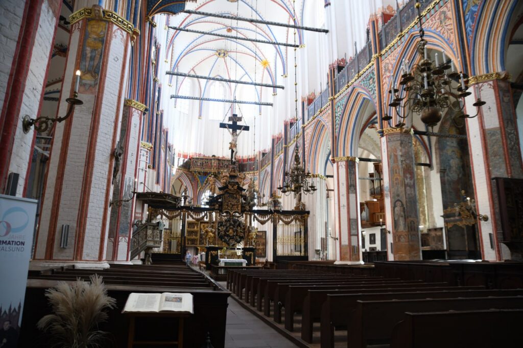 Von dort ging es ein Stück die alte Stadtmauer entlang, bis wir durch Kütertor wieder in die Altstadt gelangten. Dort kamen wir am Meeresmuseum vorbei (in einem alten Kloster untergebracht – auch dafür hatten wir keine Zeit) zum neuen Markt und der Marienkirche. Auch diese Kirch haben wir uns natürlich angesehen, sie ist sehr viel nüchterner als die Nikolaikirche, aber auch sehr schön. Vom Turm aus hat man einen guten Ausblick, wenn man sich denn den Aufstieg über immer schmaler und steiler werdende Treppen (am Ende eher Leitern) antun möchte.