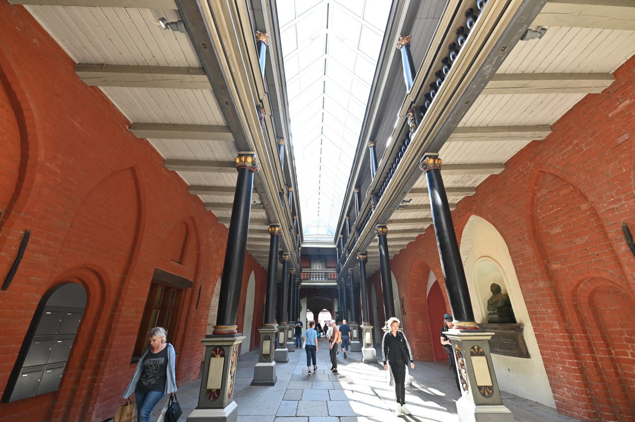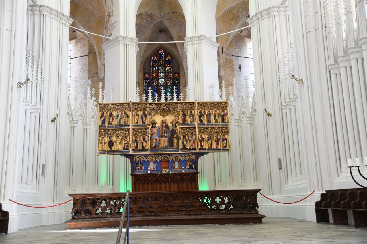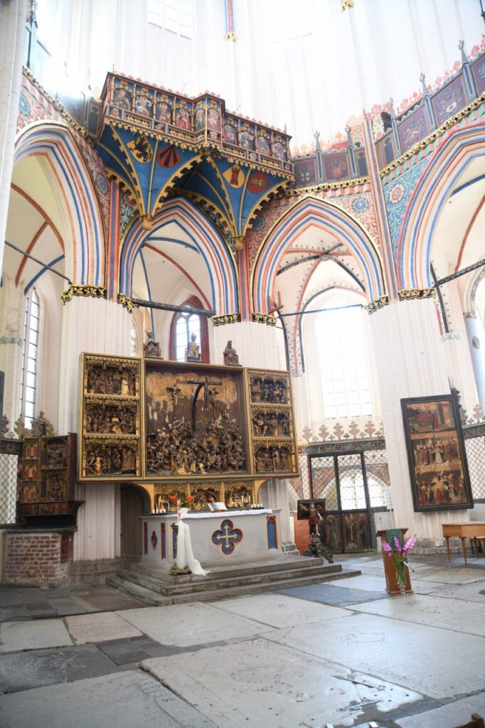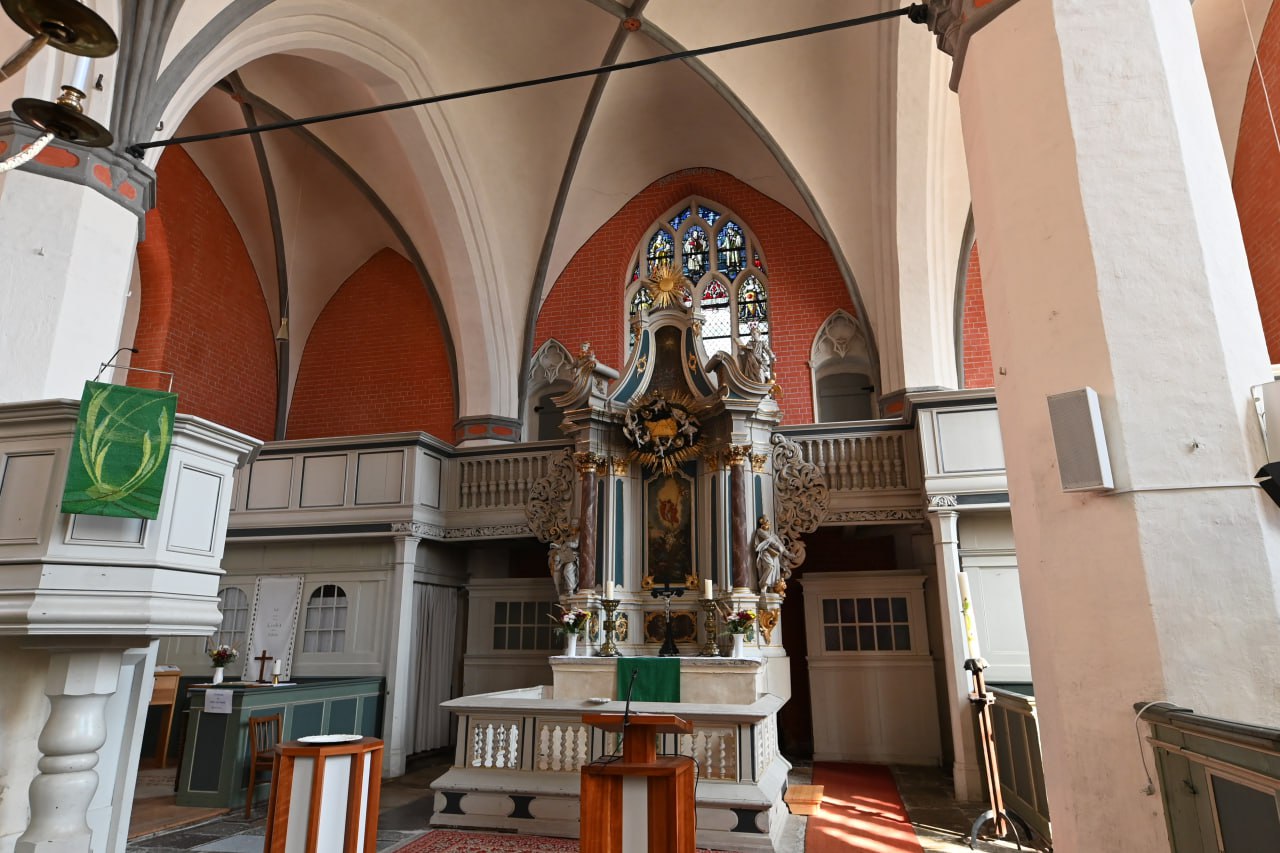 Vom Hafen aus führte uns der Weg zum alten Marktplatz. Dort sind das Rathaus mit seiner ungewöhnlichen Fassade, die Nikolaikirche und einige sehr hübsche Häuser zu finden. Die Kirche haben wir besichtigt – sie wird gerade (wie wohl schon seit einigen Jahren) renoviert und restauriert, aber das was man sehen kann, ist durchaus ansprechend.